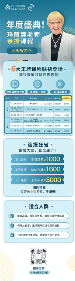 为助力学员深度探索教练技术的无限潜能,玛丽莲·阿特金森博士中国行特别推出“连报叠加,立省无忧”专属优惠政策!